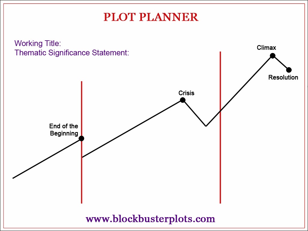 The drop in the energy of a Universal Story is symbolized on the Plot Planner by the downward line after the Crisis. This entire downward line can be viewed as the threshold separating the middle of the story from the end. Literally, a threshold is a doorsill or the starting point of an experience.